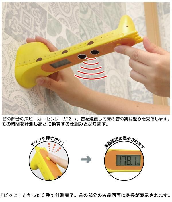 | 垂直な壁にキリンの底面をピタリとくっつけて身長の基準をつくり、後はボタンを押すだけ。 「ピッピ」とたった3秒で計測完了。首の部分の液晶画面に身長が表示されます。 |