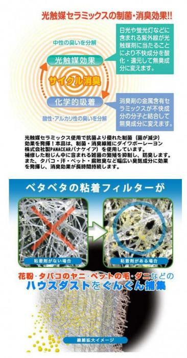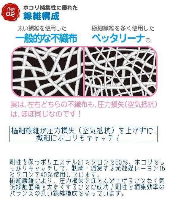 粘着材付きフィルターが花粉・ハウスダストをしっかりキャッチ!!独自開発の粘着剤付きホコリ高捕集フィルター「ペッタリーナ(R)」を使用。DIYアイデアの知恵袋「小方早苗」さんオススメの防汚アイテムです。 | |