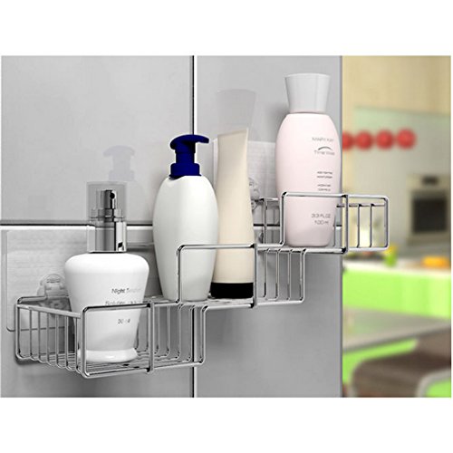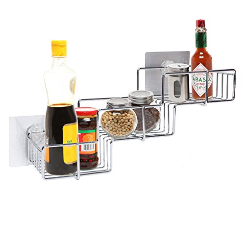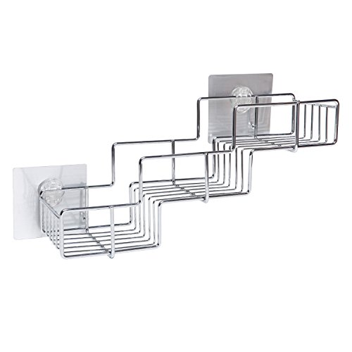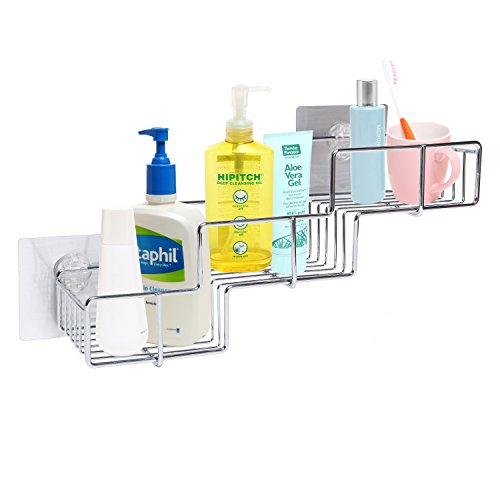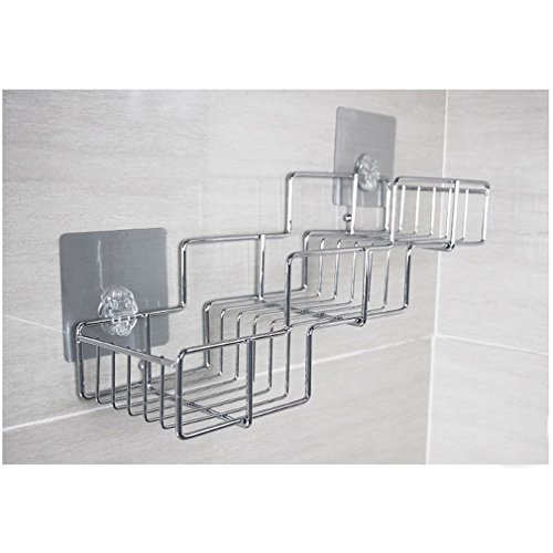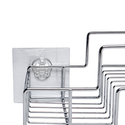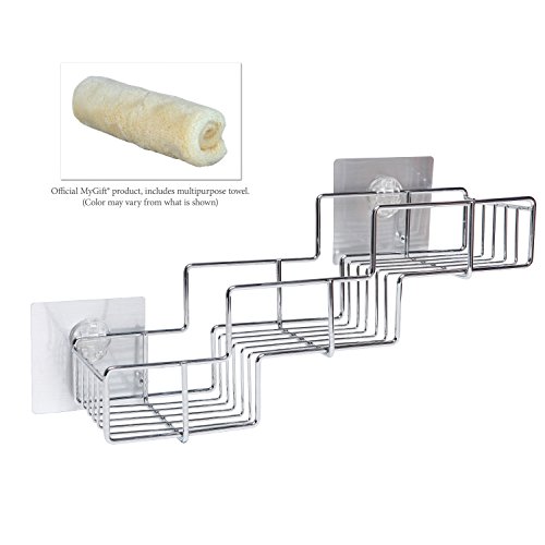 - Feature : Wall-mounted bathroom storage rack with an artistic stair-step design. / Each step-style compartment is made of sleek stainless steel bars and ideal for holding various items in your bathroom or kitchen. / Easy to install using the strong yet flexible adhesive panels. For best results, use on tile or glass (or other non-porous surface). / **Official MyGift® product includes multipurpose cleaning towel.** / Approximate Dimensions: 14.25" W X 6.5" H X 4.75" D.