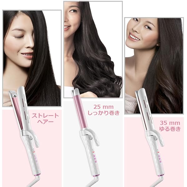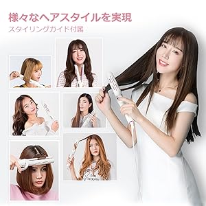 ストレート、3Dウェーブ、カール、巻き髪、ボブヘアー、コリアンアウトワードウェイブ、Cウェイブ、コリアンウェーブパーマ、フリンジスタイルなど全部で9通りものヘアスタイルを作ることが可能です。