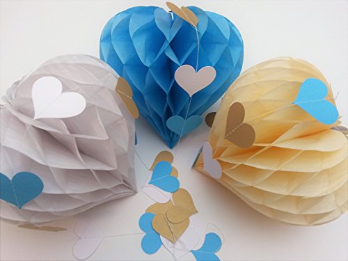 -. Binding : Health and Beauty -. Brand : Mony's Decor -. Color : Blue White Ivory -. EAN : 0653020540058 -. Feature : 1 Banner "It's a Boy" over 5 feet in length in soft Pearl white, Gold borders, Black letters with 2 Turquoise Blue Hearts / (2) - 8" Heart Shape Honeycombs in Turquoise Color / (2) - 8" Heart Shape Honeycombs in Pearl Color / (2) - 8" Heart Shape Honeycombs in White Color / 2 Heart Garland with over 8 feet in length and 30 little hearts in Turquoise, White and Soft Glitter Gold for each piece -. IsAdultProduct : 0 -. Label : Mony's Decor -. Manufacturer : Mony's Decor -. MPN : 5 -. PackageQuantity : 9 -. PartNumber : 5 -. ProductGroup : Health and Beauty -. ProductTypeName : HEALTH_PERSONAL_CARE -. Publisher : Mony's Decor -. Studio : Mony's Decor -. Title : IT'S A BOY BABY SHOWER HEART BANNER HEART SHAPED HONEYCOMBS AND HEART SHAPED GARLANDS -. UPC : 653020540058