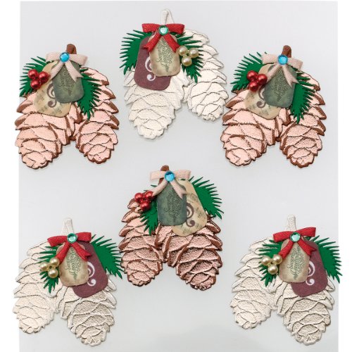 - Features bronze and gold foil pinecones with pearls, gems, tags and ribbon accents