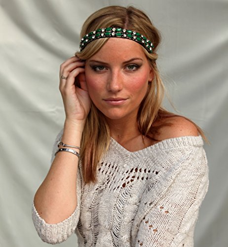 This Emerald Green Rhinestone headband features round faceted rhinestones in the middle encompassed by surrounding emerald rhinestones embellishments along the band. This style is very bohemian and great for any outfit. Can be worn in short, med, or long hair. With all its glitz and glamour these unique headbands are backed by a high quality velvet so your hair does not catch while styled. Comes with a style guide so you can choose your style. Rhinestone headbands are fun, edgy, and pairs great to accentuate any outfit. Wear the headbands in a range of looks to compliment any type of hair. These are the new accessory to go with everything. Headbands are constructed with an elastic stretch band for a secure fit and are easy and comfortable to wear. Back of headband is a black elastic band, one size fits all. Look Sheet Guide comes with to show multiple ways to wear the headband.Feature