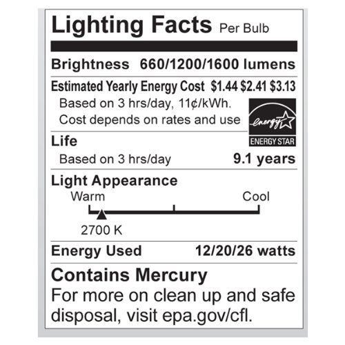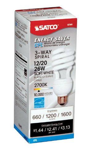 Satco S7341 12/20/26-Watt Medium Base 3-Way Spiral, 2700K, 120V, Equivalent to 30/70/100-Watt Incandescent Lamp with Energy Star Rated