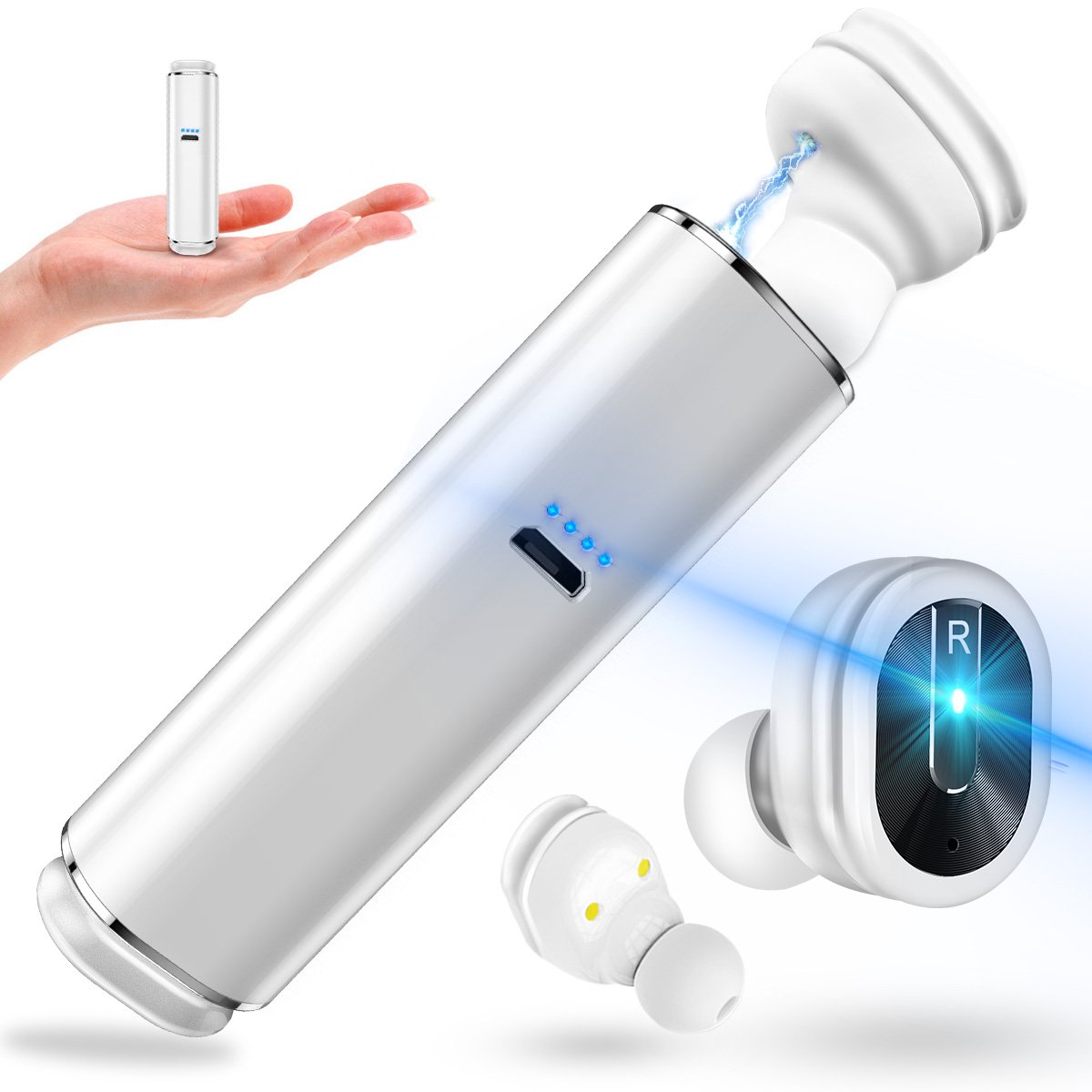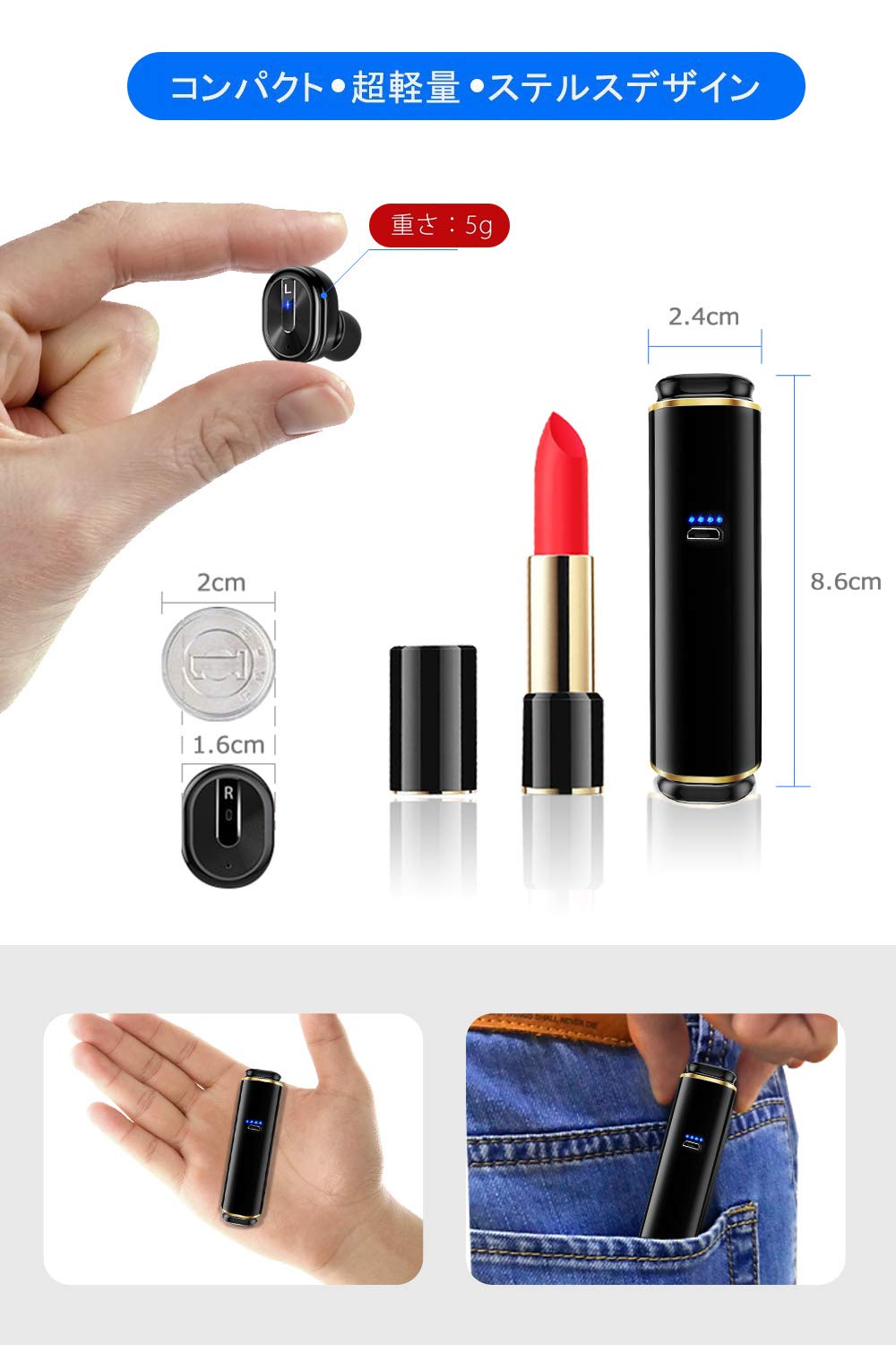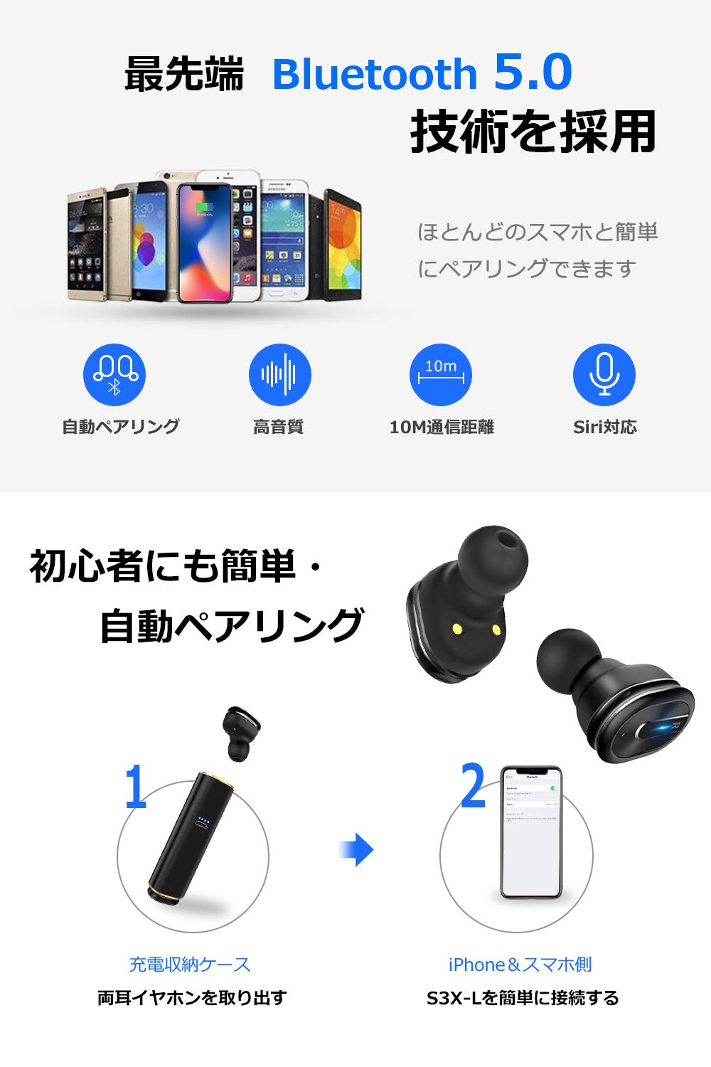 ♬【充電式収納ケース】ケース自体が充電器を兼ねた一体型なBluetoothイヤホンです。イヤホンを紛失防止だけではなく、同時に繰り返し充電も出来ます。シンプルで操作簡単なワンボ タンヘッドセットデザイン、多機能をワンボタンに集中しています。【コンパクトタッチ設計】ワンボタンで音楽再生/一時停止/次の曲をスキップ、通話開始/終了/拒否などの操作をすべて実現可能です。片手でワンボタンを便利で操作できます。