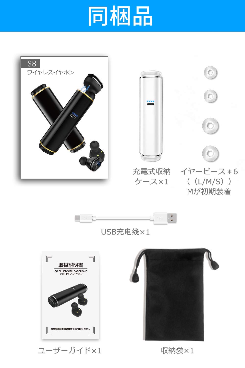 ♬【パッケージ内容】イヤホン×2、携帯式充電ボックス×1、マイクロUSBケーブル×1、イヤーピース*6(S/M/L)、日本語取扱説明書(日本語取扱説明書または付属品が不足になった場合、販売店にメールを送信していただければ、再発行する対応ができます)。
