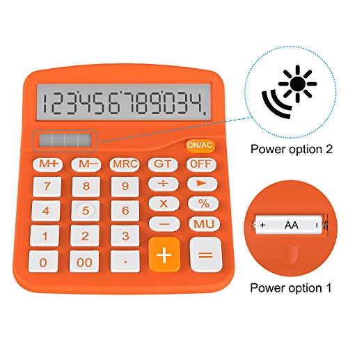 -. Feature : Two-way Power: Solar and Battery (one AA battery NOT included) / Large 12-digit display / Desktop calculator / Tax and Currency conversion, Function and Command Signs / On and Off buttons, Profit margin %, +,-, Key Rollover