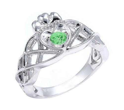 -. Binding : Jewelry -. Brand : Claddagh Rings -. Department : womens -. Feature : Irish Claddagh ring individually hand-set with a green-colored cubic zirconia center stone / carefully handcrafted with authentic 925 sterling silver in expert polished finish / comes with free special gift packaging / made in the USA yet offered at factory direct jewelry P.R.Ice / ships from the manufacturer directly to the customers -. Label : Claddagh Gold -. Manufacturer : Claddagh Gold -. Model : DCK2071SV -. MPN : DCK2071SV -. PartNumber : DCK2071SV -. ProductGroup : Jewelry -. ProductTypeName : FASHIONRING -. Publisher : Claddagh Gold -. Studio : Claddagh Gold -. Title : 925 Sterling Silver Solitaire Green CZ Celtic Knot Claddagh Ring