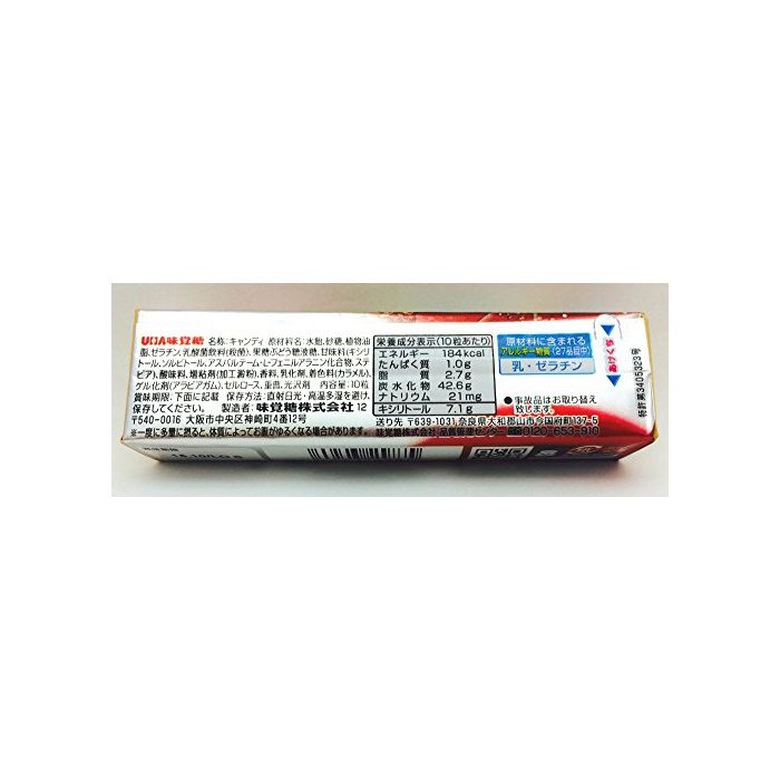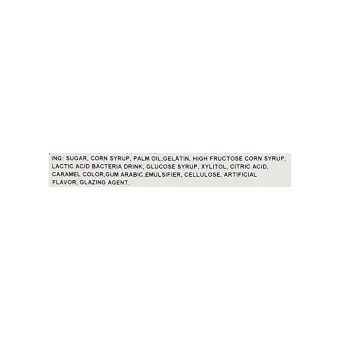 원재료:수 엿,설탕,식물성 가공 유지,젤라틴,살균 유산균 음료,과당 포도당액당,식물성 기름지,덱스트린,감미료(기시리토루,솔《비토루》,아스 PAL《데무》L?회《니루아라닌》화합물,《스쿠라로스》,스테 비어)고, 신맛료,증점제(가공 전분)고, 향료,유화 제,착색료(카라멜)고, 겔화 제(아라비아 껌)고, 중탄산,셀룰로오스,광택 제
