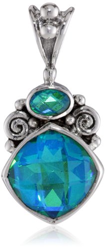 The mesmerizing Sajen Sterling Silver Caribbean Quartz Pendant offers bold blue-green gemstones for plenty of flair. The pendant's Caribbean quartz stones are aligned vertically, and their vivid color is reminiscent of a tropical ocean. The large stone on the bottom is square- while the top gemstone is oval. The stones are set off by polished 925 sterling silver borders with elegant scroll-like details. The pendant hangs from a sterling silver bail that looks classic and polished. The pendant is 1.32 inches long and .61 inches wide and can be strung on any type of silver-tone chain.Feature