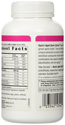 -. Binding : Health and Beauty -. Brand : Kyolic -. Department : Health and Beauty>Health and Wellness -. EAN : 0023542105422 -. Feature : Kyolic -. IsAdultProduct : 0 -. Label : Kyolic -. LegalDisclaimer : * These statements have not been evaluated by the Food and Drug Administration. This product is not intended to diagnose, treat, cure or prevent any disease. ** Always refer to the manufacturer's label on the product for description, recommended dose and precautions. -. Manufacturer : Kyolic -. Model : hhh-kyyy-tra-rat3570 -. MPN : 026068-7 -. NumberOfItems : 1 -. PackageQuantity : 1 -. PartNumber : 026068-7 -. ProductGroup : Health and Beauty -. ProductTypeName : HEALTH_PERSONAL_CARE -. Publisher : Kyolic -. Size : 200 Capsules -. Studio : Kyolic -. Title : Kyolic Garlic Formula 105 Detox & Anti-Aging (200 Capsules) -. UPC : 601678805999