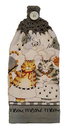 Handcrafted Grey Crochet Topped Cat Chef Theme Kitchen Towel