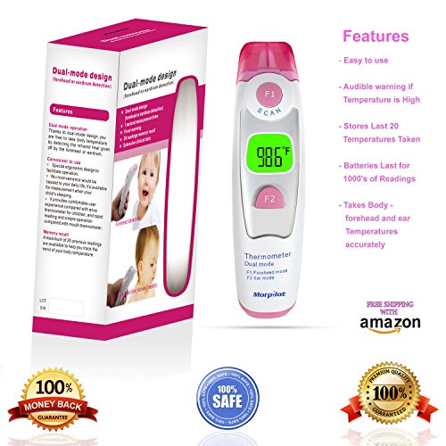- Feature : QUICK AND ACCURATE BODY TEMPERATURE - The Morpilot digital thermometer gives consistent and accurate temperature reading every time you use it. Morpilot uses infrared technology to take the forehead or eardrum temperature of a person. Unlike old-fashioned mercury-in-glass thermometers which take a lot of time & patience for taking temperature, Morpilot quickly detects the accurate body temperature. / EASY TO USE - Using Morpilot is very easy - thanks to its clean and functional design. Simply take the cap off the thermometer, and choose forehead or ear mode by pressing appropriate button to take temperature. The temperature gets displayed in both degree Fahrenheit and degree Celsius on a digital LCD display, which is very easily and clearly readable. / SAVE TEMPERATURE READINGS & TRIGGER FIVER ALARM - With Morpilot thermometer, you can store up to 20 previous readings, which is useful when you want to monitor temperature reading over a period of time. The thermometer also triggers a visual and auditory fever alarm when temperature exceeds 99.5 °F. / 100% SATISFACTION GUARANTEE - We offer 100% risk-free satisfaction guarantee to let you buy with confidence. However, we are quite confident that you are going to love this thermometer and will recommend it to many others. / DUAL MODE-PERFECT FOR ALL AGE GROUPS - Morpilot thermometer features dual mode temperature measurement - to let you measure temperature at both Forehead and Ears, based on your preferences and age specific requirements (ear mode suitable only for infants older than 1 year, older children and adults), you can choose the appropriate mode for measuring temperature. Unlike other thermometers in the market, this thermometer can be used for all age groups, whether you want to take temperature of a baby or an adult.