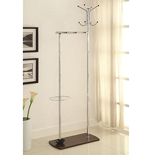-. Feature : Chrome and walnut base / Umbrella rack / Coat hat hanger rack / Product includes: 1 x coat rack