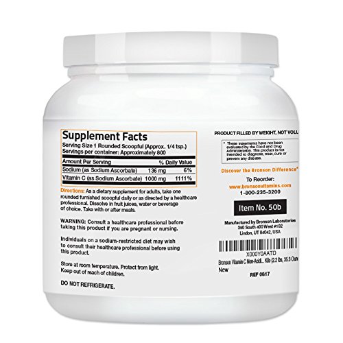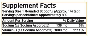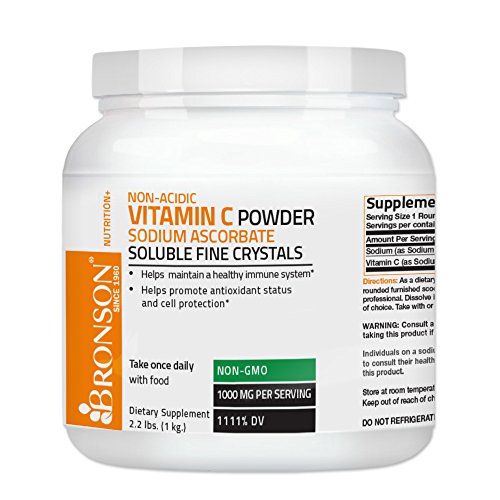 A Non-Acidic Vitamin C that is gentle on the stomach. Powerful immune support!* Vitamin C is a water-soluble vitamin found in such foods as citrus fruits, green and leafy vegetables, tomatoes and cauliflower. In addition to the formation of collagen, vitamin C is a key protector of the body from the ravages of potentially harmful free radicals, as well as an effective aid in maintaining a healthy immune system. The body cannot make or store vitamin C, so it must be replaced every day because much of it is washed out of the body daily through the kidneys. To make sure you're receiving enough of the right type of vitamin C, Bronson has many special formulas. Order one today! One of Bronson's best-selling vitamin C products! In a soluble fine crystal format, it comes with a scoop for handy measuring. One furnished scoopful, supplies approximately 1,000 mg. of vitamin C as sodium ascorbic for a non-acidic Vitamin C that is gentle on the stomach. You can add it to fruit juice or water and it has a naturally tart taste.Feature