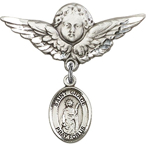 -. Title : Sterling Silver Baby Badge with St. Grace Charm and Angel w/Wings Badge Pin 1 1/8 X 1 1/8 inches