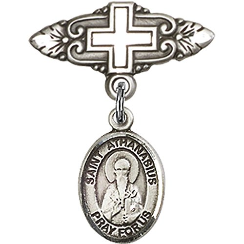 -. Title : Sterling Silver Baby Badge with St. Athanasius Charm and Badge Pin with Cross 1 X 3/4 inches