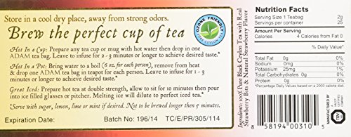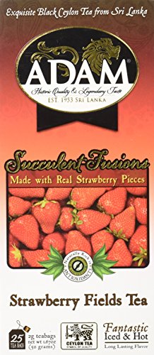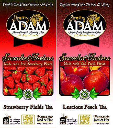 -. Binding : Grocery -. Brand : Adam -. EAN : 0852793006901 -. Feature : This combination 4 pack features 2 of our hottest selling iced teas / 2 Boxes of LUSCIOUS PEACH TEA: premium high grown Ceylon tea blended with real peach pieces and natural peach flavor A total of 50 teabags of peach tea / 2 Boxes of STRAWBERRY FIELDS TEA: premium high grown Ceylon tea blended with real strawberry fruit pieces and a natural strawberry flavor A total of 50 teabags of strawberry tea / True double chamber microwave safe teabags, enhance infusion which results in a richer, stronger, more flavorful brew / Specially blended for Iced Tea, One teabag makes 12 - 16 ounces of iced tea -. Label : Adam Expo -. Manufacturer : Adam Expo -. MPN : 852793006901 -. NumberOfItems : 1 -. PackageQuantity : 1 -. PartNumber : 852793006901 -. ProductGroup : Grocery -. ProductTypeName : GROCERY -. PublicationDate : 2015-08-20 -. Publisher : Adam Expo -. ReleaseDate : 2015-08-20 -. Studio : Adam Expo -. Title : Adam Refreshing Iced Tea Strawberry and Peach Combo, 100 Count -. UPC : 852793006901