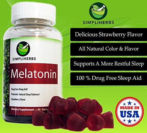 -. Binding : Health and Beauty -. Brand : SimpliHerbs -. EAN : 0643217485224 -. Feature : ★100% Drug Free: Each Serving Contains 5mg Of Melatonin To Assist In The Establishment Of Healthy Sleep Patterns / ★Delicious Natural Strawberry Flavor: No Artificial Flavors Here! / ★For Natural Sleep, Not Medicated Sleep: SimpliHerbs Melatonin Works In Harmony With Your Natural Sleep Cycle To Give You The Tranquil Rest You Deserve / ★Trust In SimpliHerbs: High Quality Products Made In The USA In An FDA Inspected GMP Certified Facility. Every Batch Of Product We Produce Is Third Party Tested To Ensure The Purity & Potency. We Fully Guarantee Our Products & Are Confident You Will Love Your Supplement! If For Whatever Reason You Are Unhappy With Your Purchase, We Offer A Full 60 Day Money Back Guarantee! -. IsAdultProduct : 0 -. Label : SimpliHerbs -. Manufacturer : SimpliHerbs -. MPN : SHME60 -. PackageQuantity : 1 -. PartNumber : SHME60 -. ProductGroup : Health and Beauty -. ProductTypeName : HEALTH_PERSONAL_CARE -. Publisher : SimpliHerbs -. Studio : SimpliHerbs -. Title : SimpliHerbs Melatonin Gummies 5 mg Strawberry Flavor - 60 Gummies - 100% Drug Free - All Natural Flavors - No Artificial Colors -. UPC : 643217485224