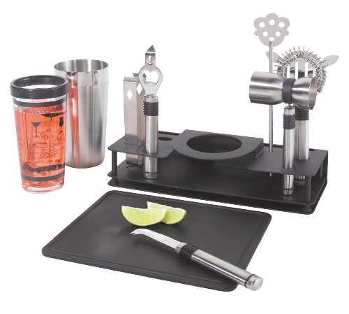 - Includes a double jigger and a 2-piece glass and stainless shaker set for mixing drinks