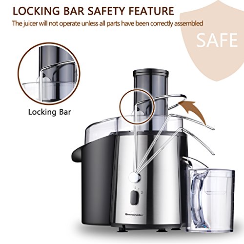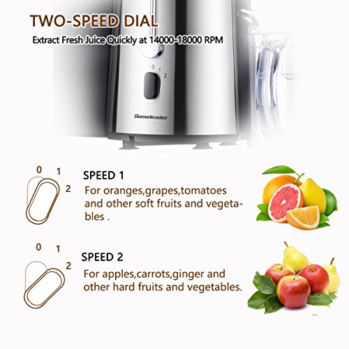 •Two-Speed Motor,“1”low speed for soft fruits like oranges,grapes and melons; “ 2 ”high speed for hard fruits like carrots,celery and beets Safety Locking Arm and Overheat Protection