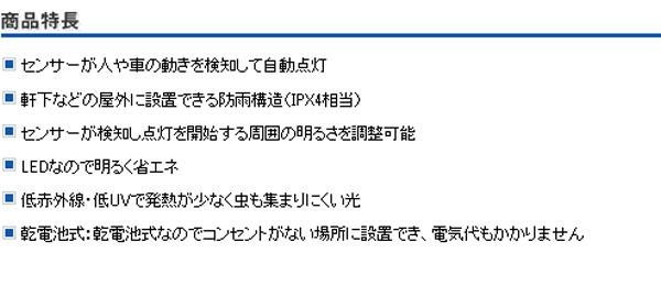 | 仕様 | ●電源:DC6V(単三形アルカリ乾電池×4本) ※電池別売 ●電池寿命:約6ヶ月(1日10回点灯時) ●光源:白色LED×1灯(全光束90lm) ※LEDの交換は不可 ●耐水性能:IPX4(防沫形) ●使用周囲温度範囲:-20度~+45度 ●検知方法:赤外線受動式 ●点灯保持時間:約15秒(固定) ●点灯開始照度:約5lx(夜)~(昼) |