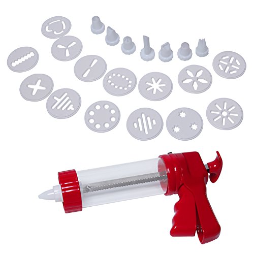 - THE PERFECT GIFT WITH A MULTITUDE OF USES: Measures 2-inch in diameter and 8.86-inch in height. Not need to add the dough frequently. 14 sturdy plastic discs in fun shapes including holiday shapes such as a wreath, pumpkin, Christmas tree, flowers, ribbon and snowflake. 8 decorating tips to make unique shapes and designs for easy icing. Perfect for Spritz cookies and cupcakes.