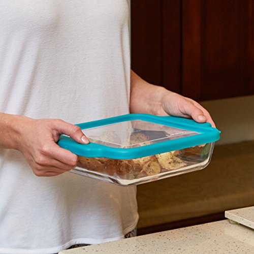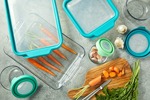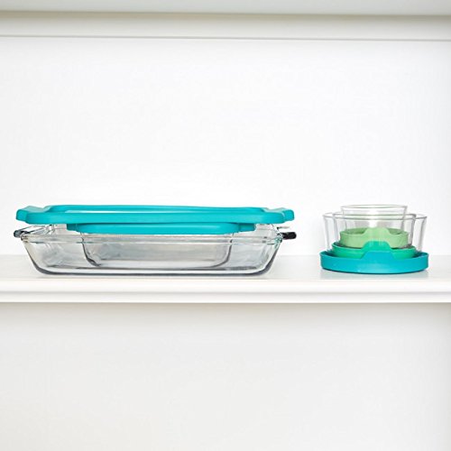 Set contains: 3-quart baking dish with Teal Infusion True Fit lid. 8" Sq cake dish with Teal Infusion True Fit lid. 1-cup round glass storage dish with Key Lime TrueSeal lid