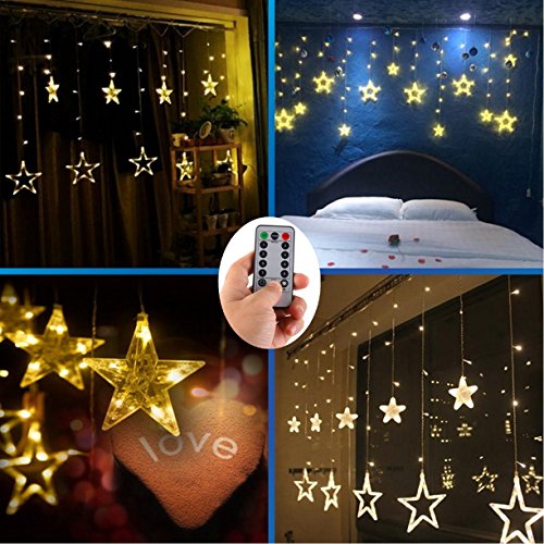 - 8 Modes 12 Star 138 LED warm white LED ;can switch modes and brightness by remote control (with 6 Hour Daily Timer) also can switch modes by battery box;Remote control distance:more than 16.4 feet/5 meters.