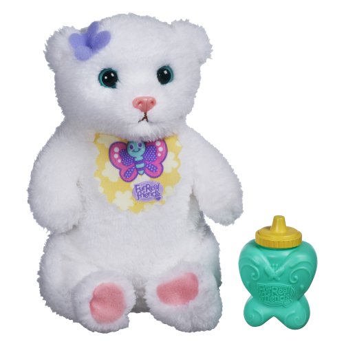 There's nothing cuter than a baby animal, and this Hiccup Bear pet is as cuddly and adorable as a real bear cub! She loves to be fed and cuddled, so give her a bottle as you hold her close. When you press her mouth, she'll kick and make giggling sounds! This fancy little cub will always be baby-cute, and she's all yours! FurReal Friends and all related characters are trademarks of Hasbro.Feature