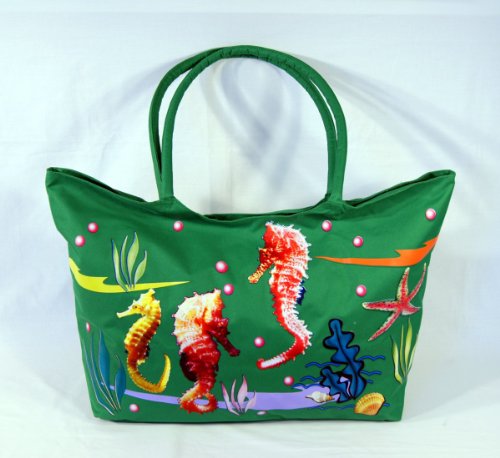 Water Resistent Jumbo Green Canvas Beach Tote Bag Seahorse Design Zipper Closure 24 x 15 x 6"