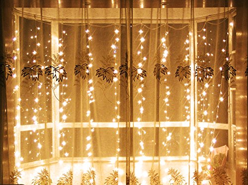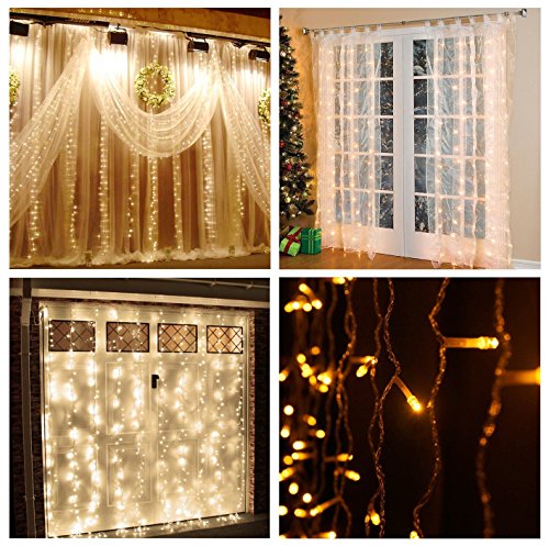 Bjour BGGD-3 18W Curtain Icicle Lights Christmas String Fairy Light Warm White, 300 LEDs, 8 Lighting Modes, 9.84ft Length x 9.84ft Width