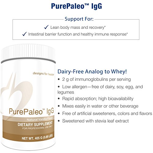-. Feature : This novel bovine serum albumin (BSA) protein promotes growth and maintenance of lean muscle mass in bodybuilders and is ideal for individuals who avoid dairy, or anyone who is looking for a low allergenic protein with high digestibility while provoking a lower insulin response than whey. / PurePaleo IgG has an excellent array of amino acids, including high levels of branched chain amino acids (BCAAs). It also includes naturally occurring bioactive peptides, which allow for rapid amino acid delivery to promote lean muscle mass and recovery. PurePaleo IgG is a non-dairy protein, making it ideal for individuals who avoid dairy. / A small study evaluating the effects of BSA found that it has a similar absorption rate to whey while being less insulinogenic and having a greater effect on muscle tissue growth. With 2 grams of IgG per serving, PurePaleo IgG provides double the amount of IgG of most whey proteins. This supplies the perfect building blocks for protein synthesis as well as supporting gut immune function. / This product mixes easily in water or any beverage of choice. It is free of artificial sweeteners, colors, and flavors, and is sweetened with stevia leaf extract. Hypoallergenic: free of dairy, soy and egg. / Designs for Health. We work with the most reputable raw material suppliers to select the best ingredients. We then conduct internal and third party testing of the ingredients to ensure identity, potency, composition, and purity (contaminant-free).*