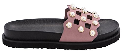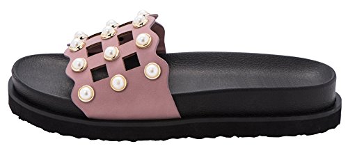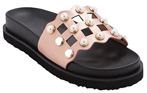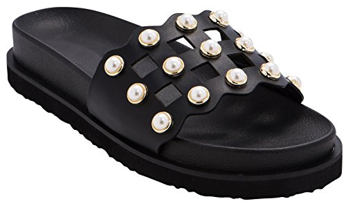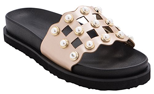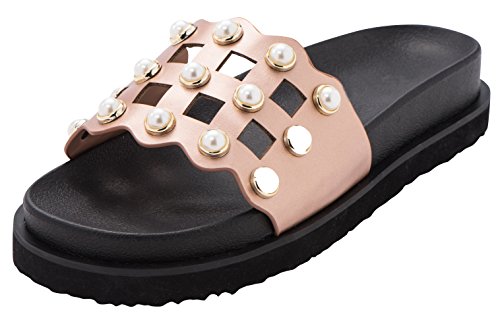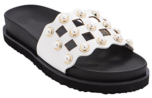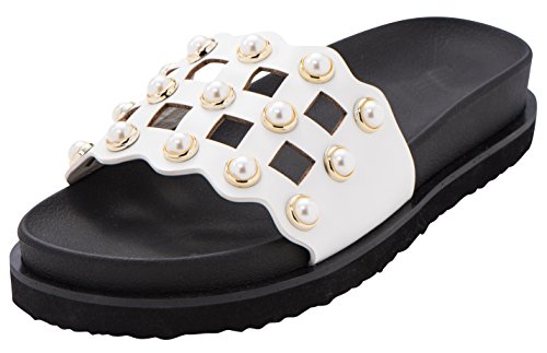 Cambridge Select Women's Open Toe Geometric Cutout Faux Pearl Flatform Slip-On Flat Slide Sandal