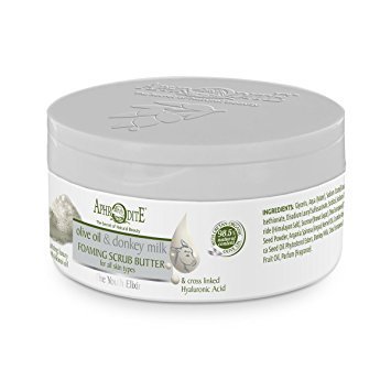 Aphrodite's latest innovation. Indulge into this airy, rich foaming butter that will cleanse, exfoliate, and hydrate leaving the skin soft and comforted. Key Ingredients: donkey milk, argan, Abyssinian oil, Himalayan salt, brown sugar & olive granules.Feature