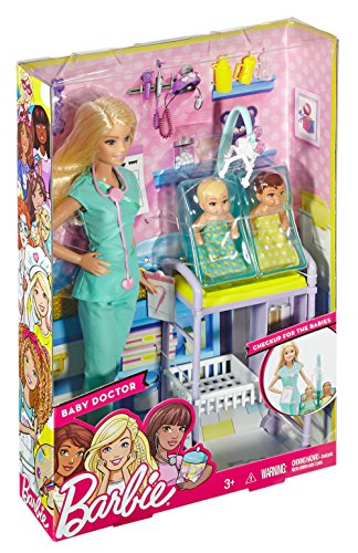 -. Binding : Toy -. Brand : Barbie -. Department : Toys -. EAN : 0887961368437 -. Edition : Baby doctor -. Feature : Let young imaginations be the doctor with Barbie dolls and medical play sets! / Barbie baby doctor doll is ready to see patients with an exam table, accessories to care for patients and TWO adorable babies / Her office set does double duty with a care station that features two tubs, a moving mobile and storage space / Themed accessories include a stethoscope, two baby towels, a bottle and a medical chart / Teal scrubs and white shoes are a perfect professional look -. IsAdultProduct : 0 -. Label : Mattel -. Manufacturer : Mattel -. Model : DVG10 -. MPN : DVG10 -. NumberOfItems : 1 -. PackageQuantity : 1 -. PartNumber : DVG10 -. ProductGroup : Toy -. ProductTypeName : TOYS_AND_GAMES -. Publisher : Mattel -. Studio : Mattel -. Title : Barbie Baby Doctor Playset -. UPC : 887961368437 -. Warranty : 1 year warranty against manufacturer defects