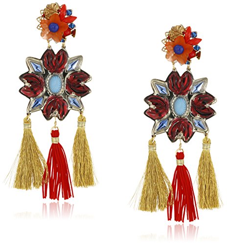 MERCEDES SALAZAR STATEMENT BLUE/RED FLORAL AND TASSEL CLIP-ON EARRINGS