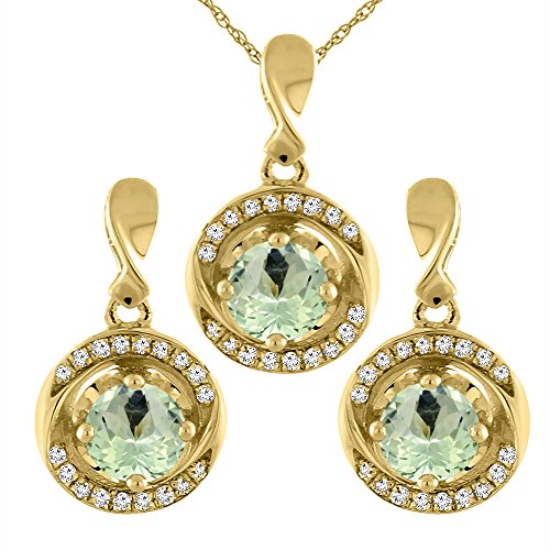 -. Title : 14K Yellow Gold Natural Green Amethyst Earrings and Pendant Set with Diamond Accents Round 4 mm