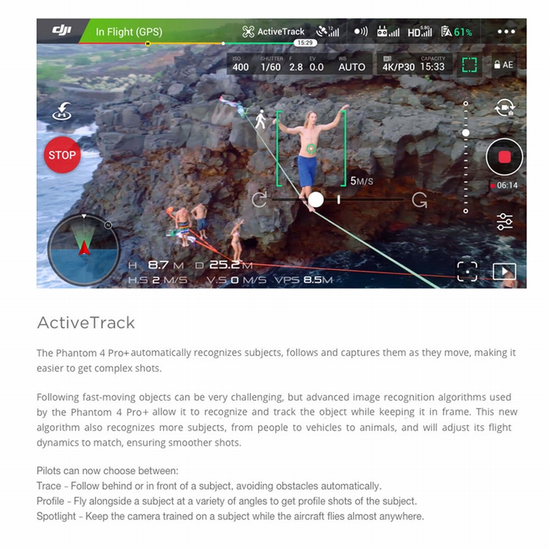 Using the DJI GO app, a large number of intelligent flight modes are available