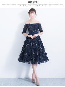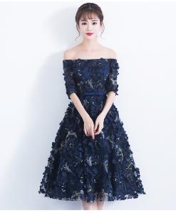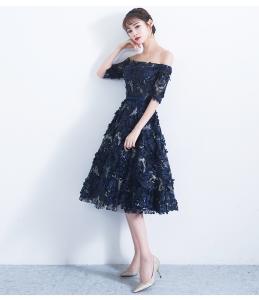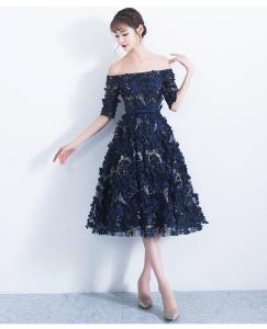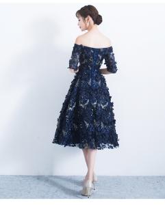 オフショルドレス パーティードレス イブニングドレス 3Dフラワー ミディアム丈 ミモレ丈 フレアスカート 5分袖