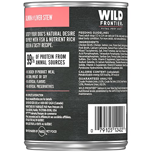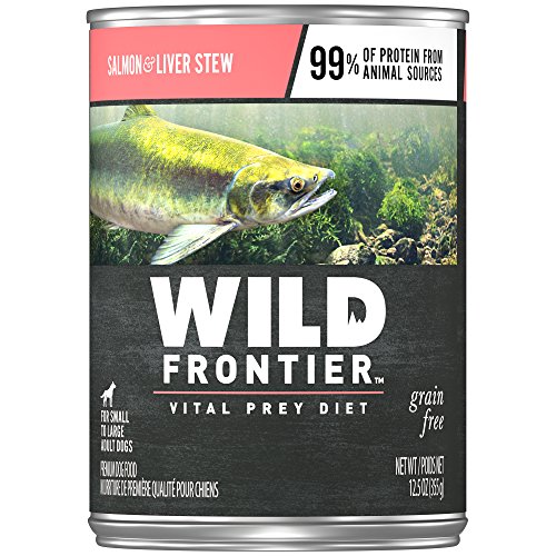 Contains (12) 12.5 oz. cans of Wild Frontier Vital Prey Salmon & Liver Stew-protein rich dog food to feed dogs' ancestral instincts