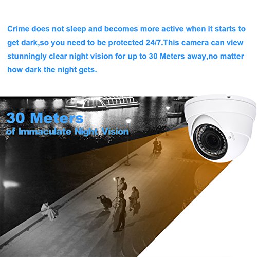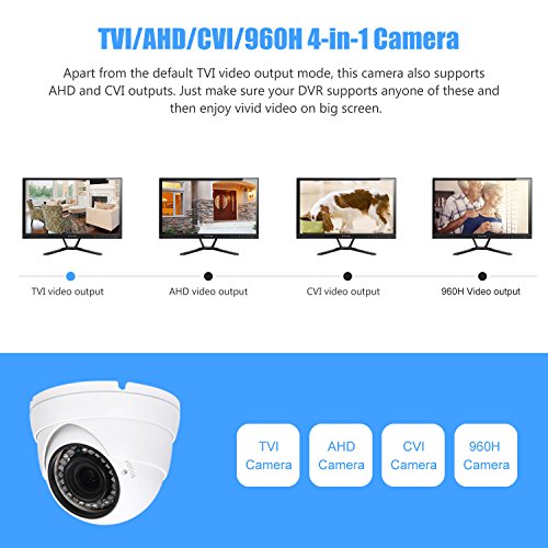 -. Feature : 4 IN 1 Security Camera :It has OSD Menu that can change the 4 different video output TVI,AHD, CVI and CVBS (700TVL) and adjust the video setting. / HD Resolution : The camera employs 1/2.7″CMOS Image Sensor with 2.1 Megapixel Resolution and an advanced circuit design. The resolution is as high as 1080P, which ensures clear and bright pictures security solution monitoring activity indoors and outdoor . / IR Night Vision : Built-in 2.8-12mm Varifocal Zoom lens, effectively extend your observation range. With 36 pcs IR infrared LEDs, it has 100 feet IR range, can change from color to black automatically and take clear picture during both day- and night-time. / Dome Camera Waterproof: The IP66 weather-rated housing provides protection from elements, including dust and sand, as well as harsh weather conditions, such as rain and snow. / Please notice:Default Video MODE is 1080P TVI MODE, Compatible with all Analog DVRs. 1080P Video Mode must be switched according to your DVR