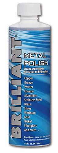 Studio : Beaumont Products Cleaning Supplies Publisher : Beaumont Products Cleaning Supplies Binding : Kitchen Product Description Brilliant Metal Polish gives even the most tarnished, dulled metal a "like-new" shine. It cleans, polishes, restores and protects most metals, providing a long-lasting, brilliant shine. Use Brilliant Metal Polish safely and effectively on the following: brass, aluminum, copper, chrome, stainless steel, and silver, including sterling. Brilliant even removes oxidation from fiberglass without damaging the gel coat. Just wipe on, rub, let dry, and then wipe off. 0