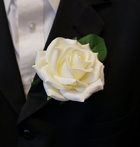 This listing is for one boutonniere/corsage. Rose Diameter: 3.5". Boutonniere height: 4". Made with one PEVA real touch rose wrapped in floral tape and decorated with greenery. A safety pin clasp is included. Color: White, ivory, or red please select from the list