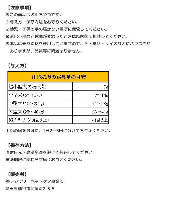 | 仕様 | 名称:犬用スナック 保存方法:常温 販売者:(株)フジサワ ペットケア事業部 賞味期間:製造日より360日 |