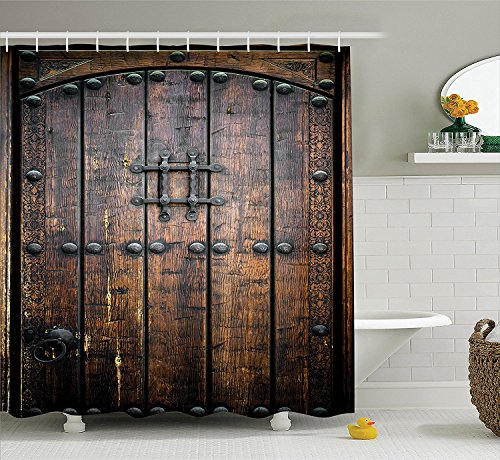 Ambesonne Rustic Decor Collection, Ancient Wooden Door Historical Vintage Exterior Medieval Structure Artistic Picture, Polyester Fabric Bathroom Shower Curtain Set with Hooks, Silver and Brown