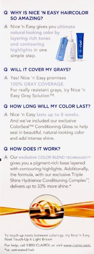 ReleaseDate : 2015-03-06 Studio : HFC Prestige International U.S. LLC Publisher : HFC Prestige International U.S. LLC Binding : Health and Beauty Product Description Living is all about trying new experiences and feeling your best. So why waste time on bland, flat hair color? That's why Clairol Nice 'n Easy permanent hair color gives you 8 weeks of true-to-you color with three salon tones for a blend of highlights and lowlights. Expertly designed to work with your unique hair, Nice 'n Easy offers salon-quality permanent hair color without the cost. Keep your color looking vibrant with Clairol CC ColorSeal Conditioner, which locks in softness and shine. To cover grays between colorings, try Nice 'n Easy Root Touch-Up to blend seamlessly with your color. For natural-looking color that's as real as you are, trust Clairol Nice 'n Easy hair color. 0