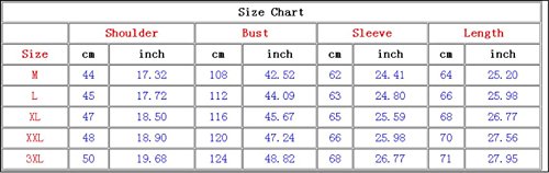 M:Shoulder:17.32"/44cm.Bust:42.52"/108cm.Sleeve:24.41"/62cm.Length:25.20"/64cm. L:Shoulder:17.72"/45cm.Bust:44.09"/112cm.Sleeve:24.80"/63cm.Length:25.98"/66cm. XL:Shoulder:18.50"/47cm.Bust:45.67"/116cm.Sleeve:25.59"/65cm.Length:26.77"/68cm. XXL:Shoulder:18.90"/48cm.Bust:47.24"/120cm.Sleeve:25.98"/66cm.Length:27.56"/70cm. 3XL:Shoulder:19.68"/50cm.Bust:48.82"/124cm.Sleeve:26.77"/68cm.Length:27.95"/71cm.
