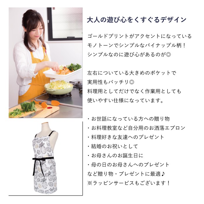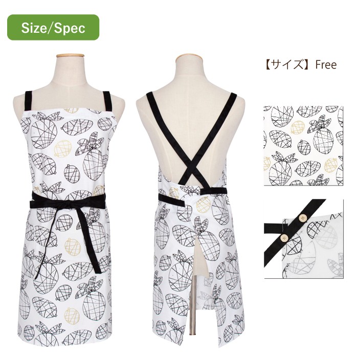 ゴールドのプリントをアクセントにしたシンプルな パイナップル柄が大人の遊び心をくすぐるエプロンです。 ■サイズ フリー 着丈(胸元のレースから裾まで) : 約71cm  ウエスト : 約84cm 腰紐(片側): 約90cm ■材 質 綿100%