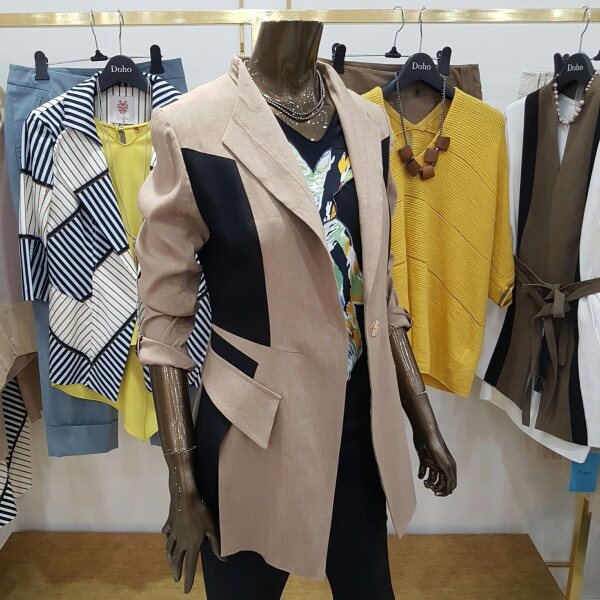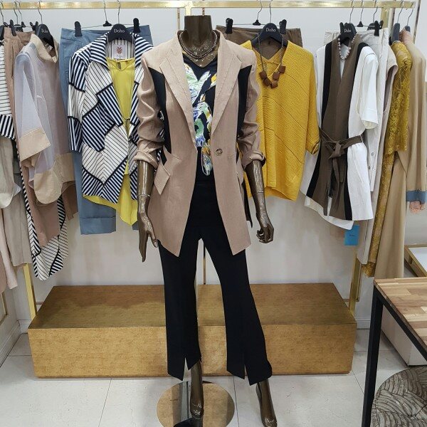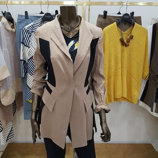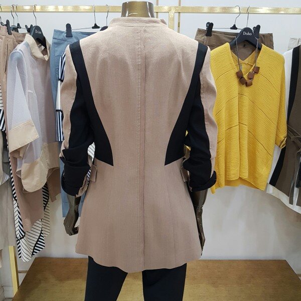 린넨 소재의 신축성이 좋은 아이템 으로 블랙컬러의 배색이 메인인 베이지 컬러와 조화롭게 어우러진 자켓 입니다
